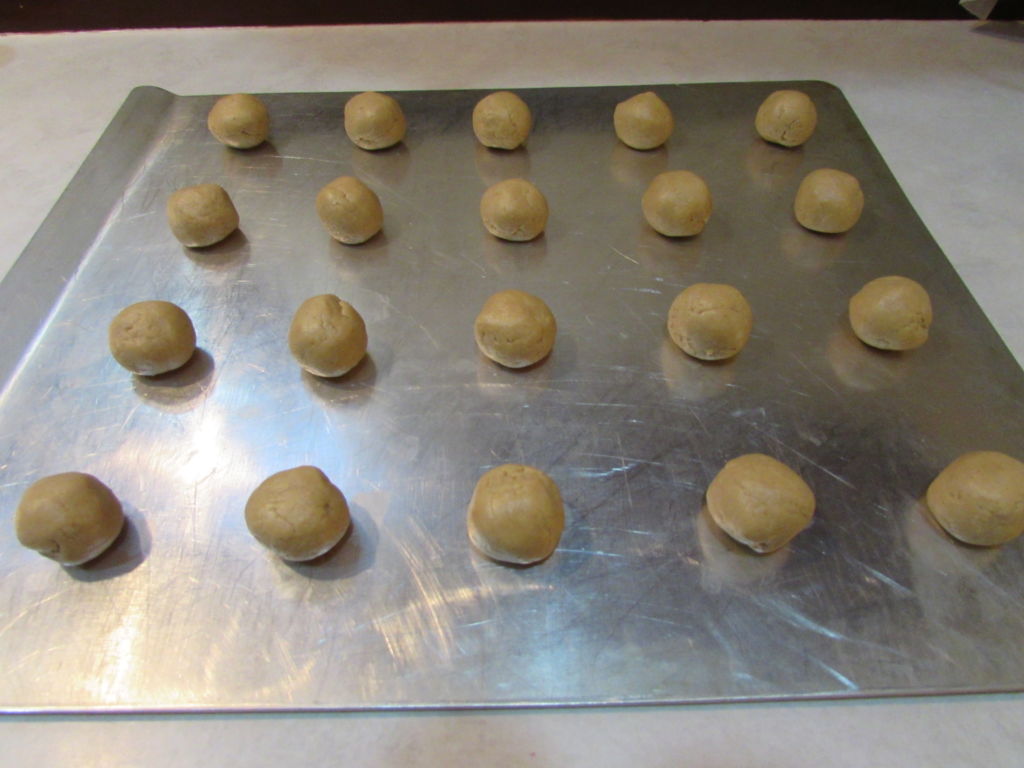 In a small mixing bowl, combine powdered sugar, peanut butter, butter and vanilla. Mix with a hand blender until well blended.- Shape into 3/4″ balls and place on cookie sheet.