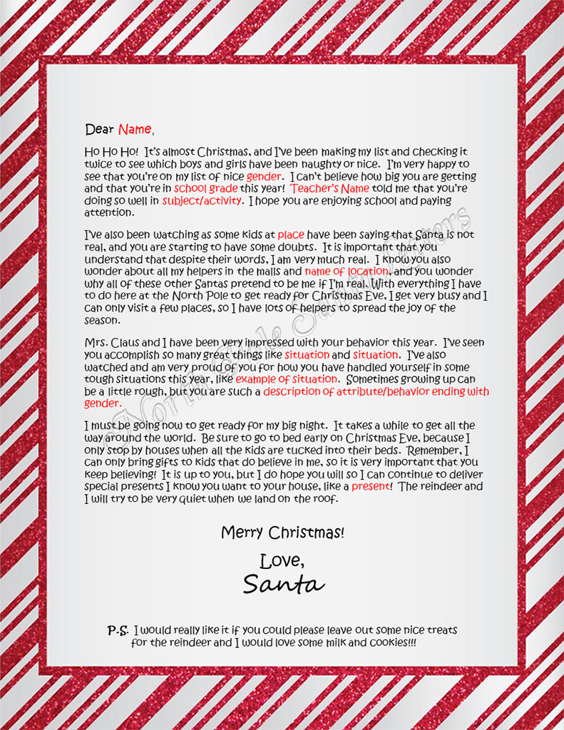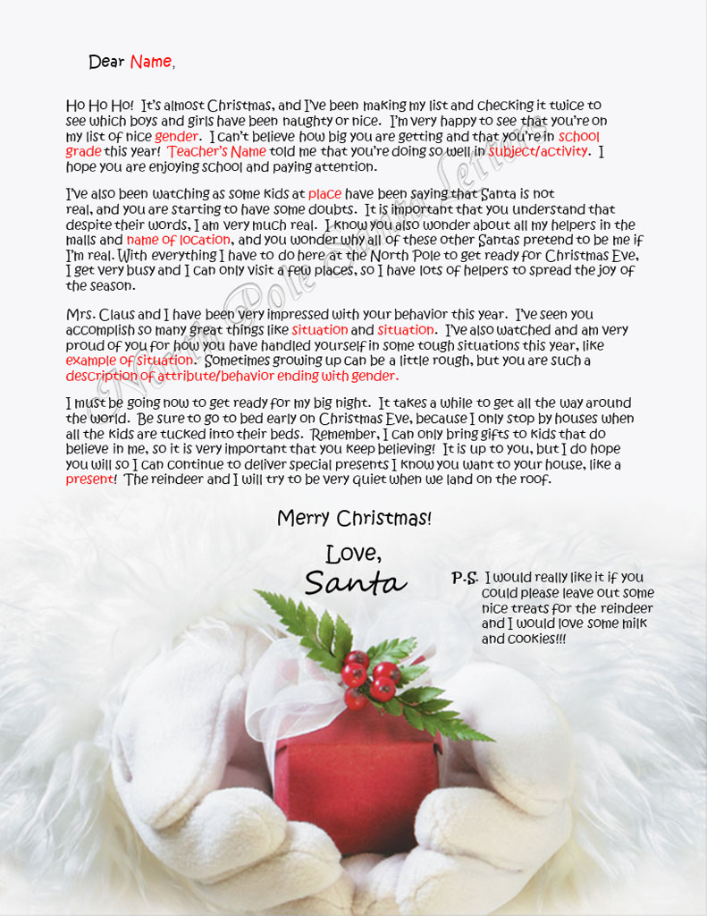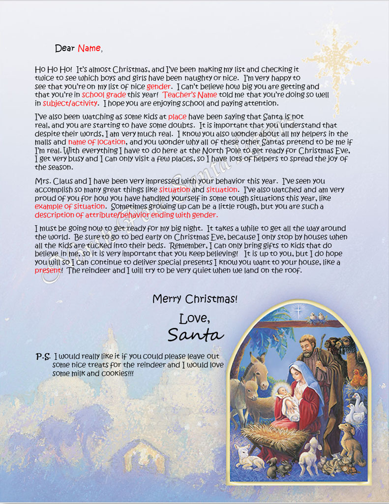 Having Doubts is a letter to answer some of the questions your child has about Santa Claus when starting to wonder if he is a real man. It talks about school, praises your child’s accomplishments and good behavior. This letter is filled with personalization.