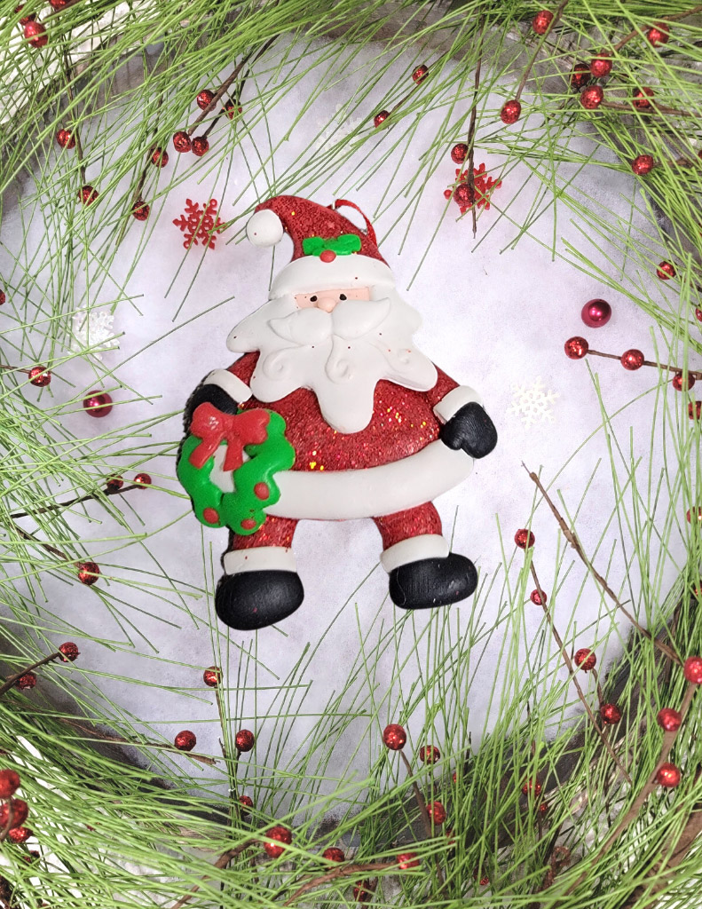 Choose from 3 super cute clay ornaments featuring a sparkly Santa Claus holding a wreath, candy cane, or stocking. Each ornament measures 3″ x 4″ and has a pre-attached ribbon to easily hang on the Christmas tree. Give your child a memory they’ll cherish when they receive this gift with their personalized letter from Santa.